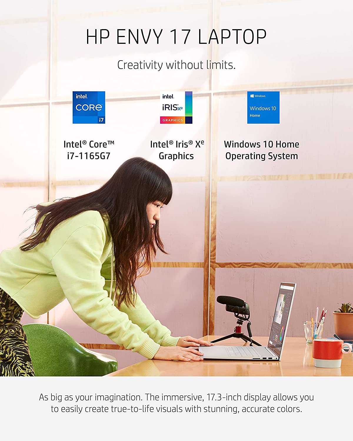 HP Envy 17 Laptop, 11ª generación Intel Core i7-1165G7, 12 GB de RAM, 1 TB de disco duro SATA y 256 GB de almacenamiento SSD, pantalla táctil IPS Full HD de 17,3 pulgadas, Windows 10 Home, cámara web HD, audio de B&O (17-cg1010nr, 2021)
