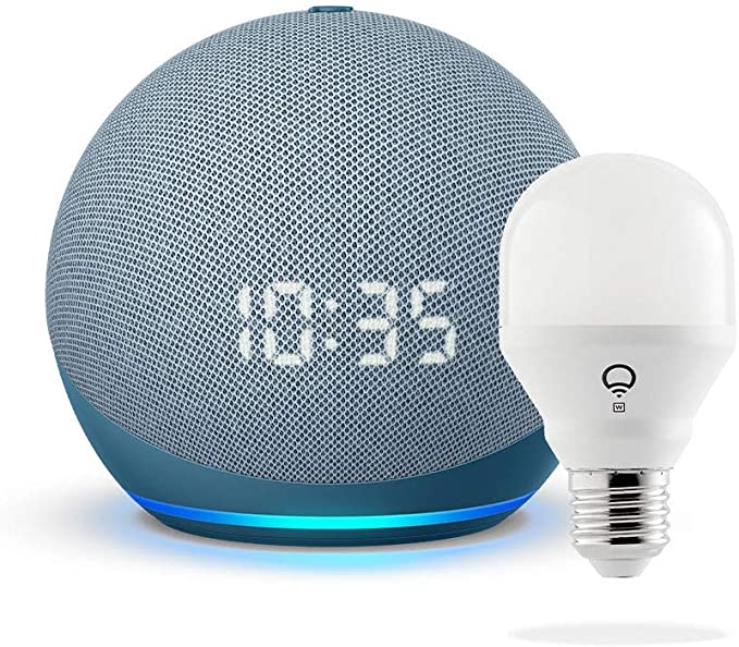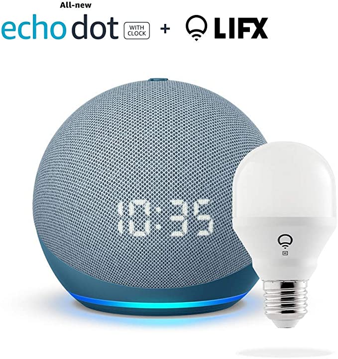 Nuevo Echo Dot con reloj (4ta Gen) – Crepúsculo Azul – Paquete con LIFX Smart Bulb (Wi-Fi)