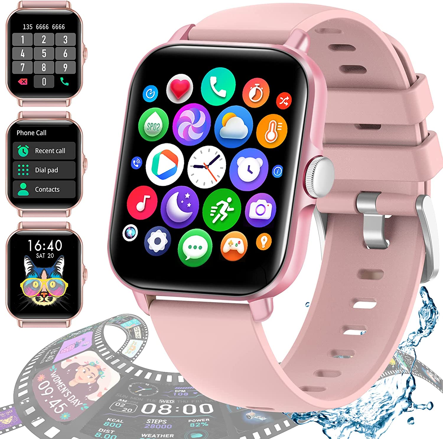 SmartwachesReloj inteligente (contestar/hacer llamada), reloj de fitness con monitor de presión arterial de frecuencia cardíaca, IP67, resistente al agua, con control de voz AI de 1.7 pulgadas, reloj inteligente para teléfonos Android iOS, hombres y mujeres, rosa
