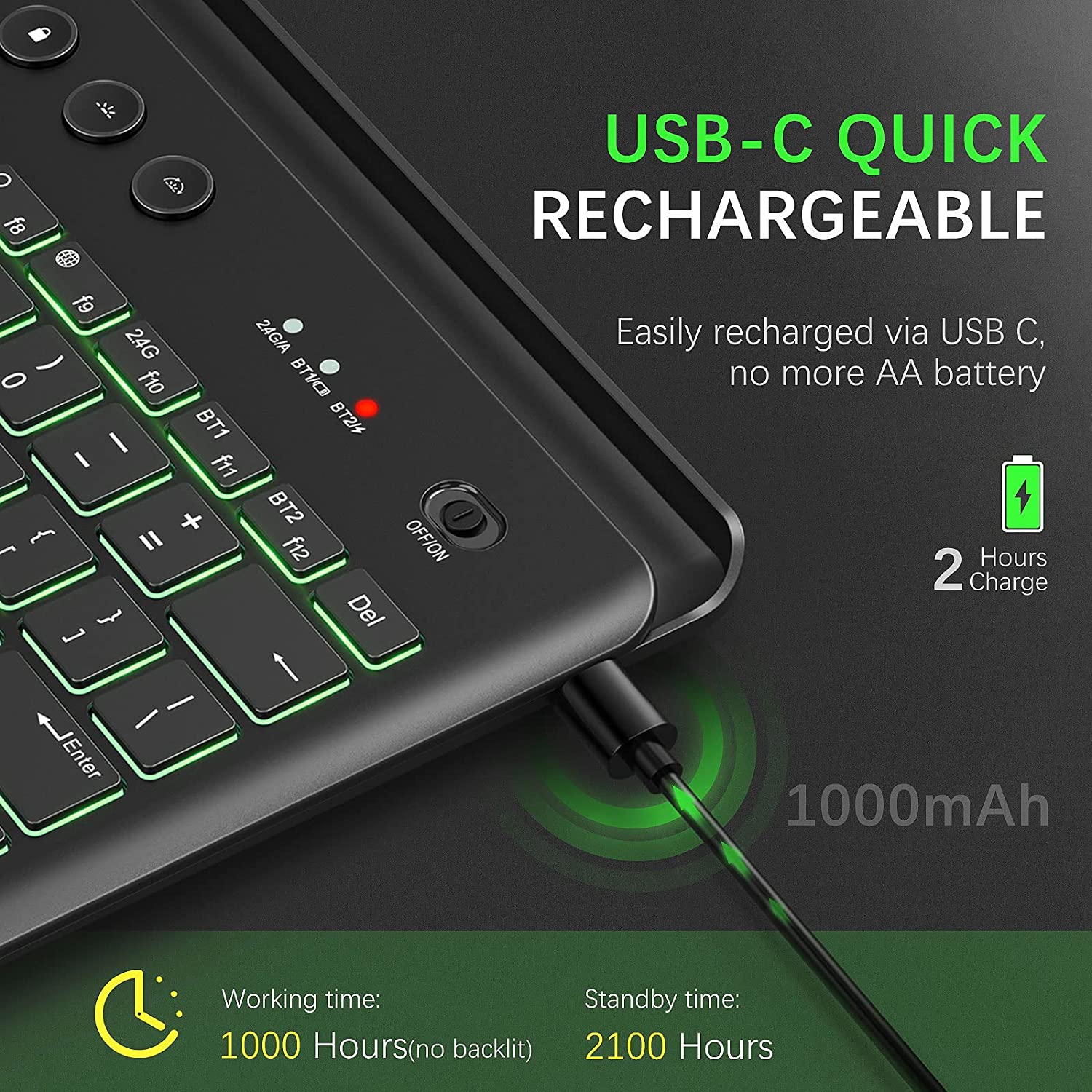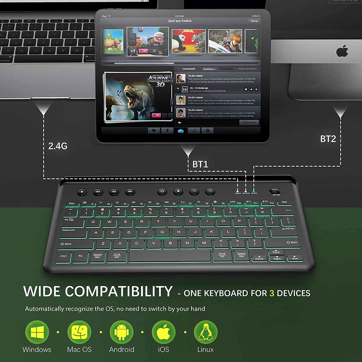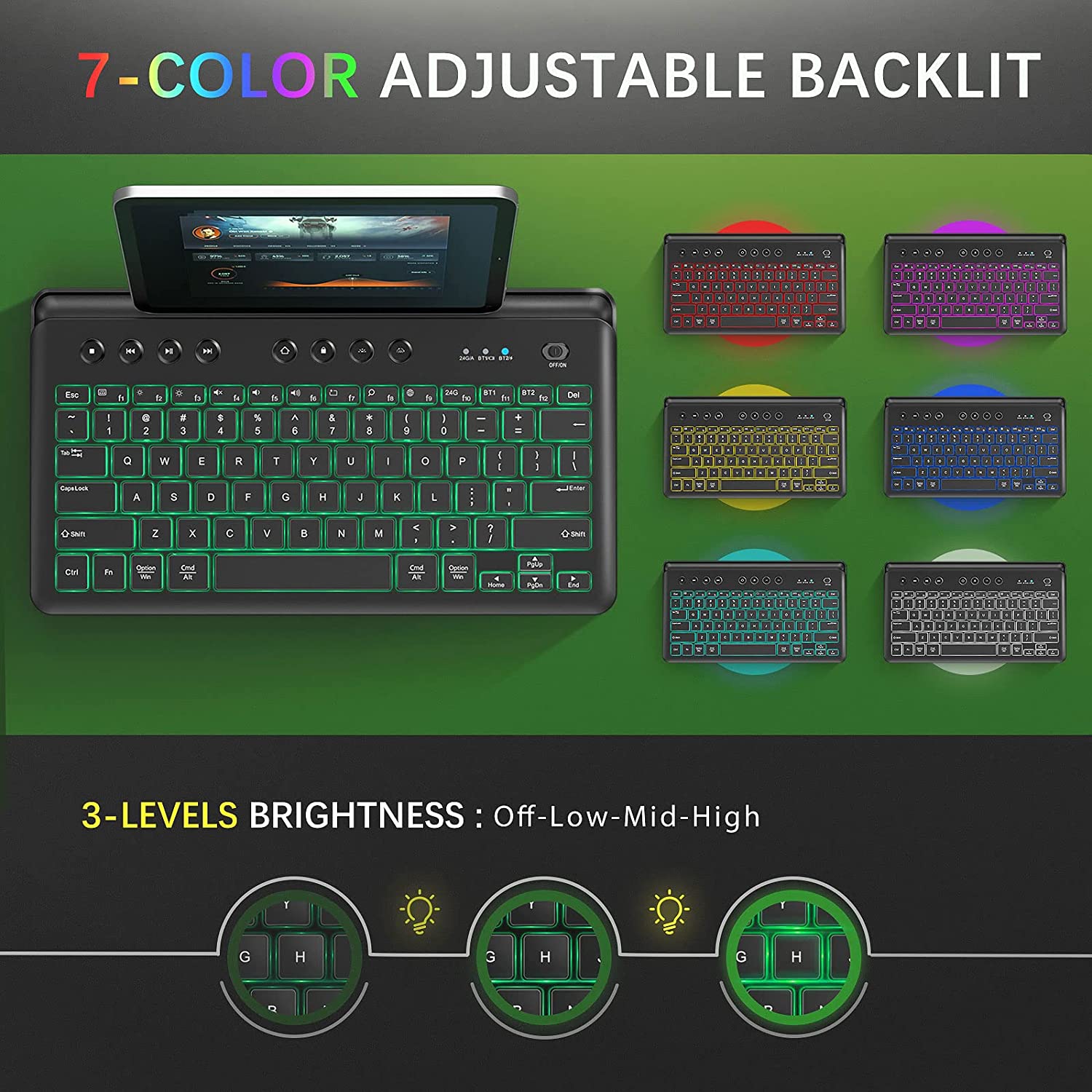 Conexión multidispositivo e interruptor multimodo el teclado se puede conectar a 3 dispositivos simultáneamente en iOS, MacOS, Windows o Android. También es compatible con teclados externos para conectar MacBook Air/Pro, iMac, Windows o laptop. Este teclado Bluetooth retroiluminado soporta conexión 2.4G, BT1 y BT2 para controlar 3 dispositivos. Puedes cambiar los modos a través del botón de interruptor de modo correspondiente para controlar los dispositivos. Diseño recargable y retroiluminado en comparación con los teclados con baterías externas, este tiene batería de gran capacidad incorporada, se puede recargar con el cable de carga adjunto. Cuando se recarga completamente, puede durar aproximadamente 60 horas de uso con trabajo constante. El teclado Bluetooth recargable tiene 7 colores de retroiluminación diferentes y brillo ajustable de 3 niveles. Diseño de soporte integrado que ahorra espacio el soporte superior integrado puede sostener el teléfono, la tableta u otros dispositivos móviles fácilmente. Puede mantener un ángulo adecuado para que leas y escribas simultáneamente. El teclado inalámbrico funcional ofrece el soporte integrado que ahorra espacio para ayudarte a sostener algunos dispositivos que ahorran espacio y hacen que tu escritorio esté ordenado. Teclas silenciosas y apagado automático las tapas silenciosas con el diseño del interruptor de tijeras hacen que el ruido de escritura se reduzca en gran medida. No te preocupes por el ruido, y puedes disfrutar de un ambiente de trabajo silencioso, adecuado para la oficina, el hogar, la biblioteca y otros lugares públicos. La función de apagado automático ahorrará energía y prolongará la vida útil del teclado inalámbrico. Trabaja sobre la marcha puedes trabajar en cualquier lugar y en cualquier momento con el teclado Bluetooth debido a su diseño compacto y ligero, innecesario llevar tu portátil pesado a todas partes. Es compatible con varios dispositivos, incluyendo iPhone, iPad, Lenovo, iPad Air, iPad Pro, iPad Mini, teléfono celular, tableta, PC, iOS, Windows, Android y otros dispositivos.