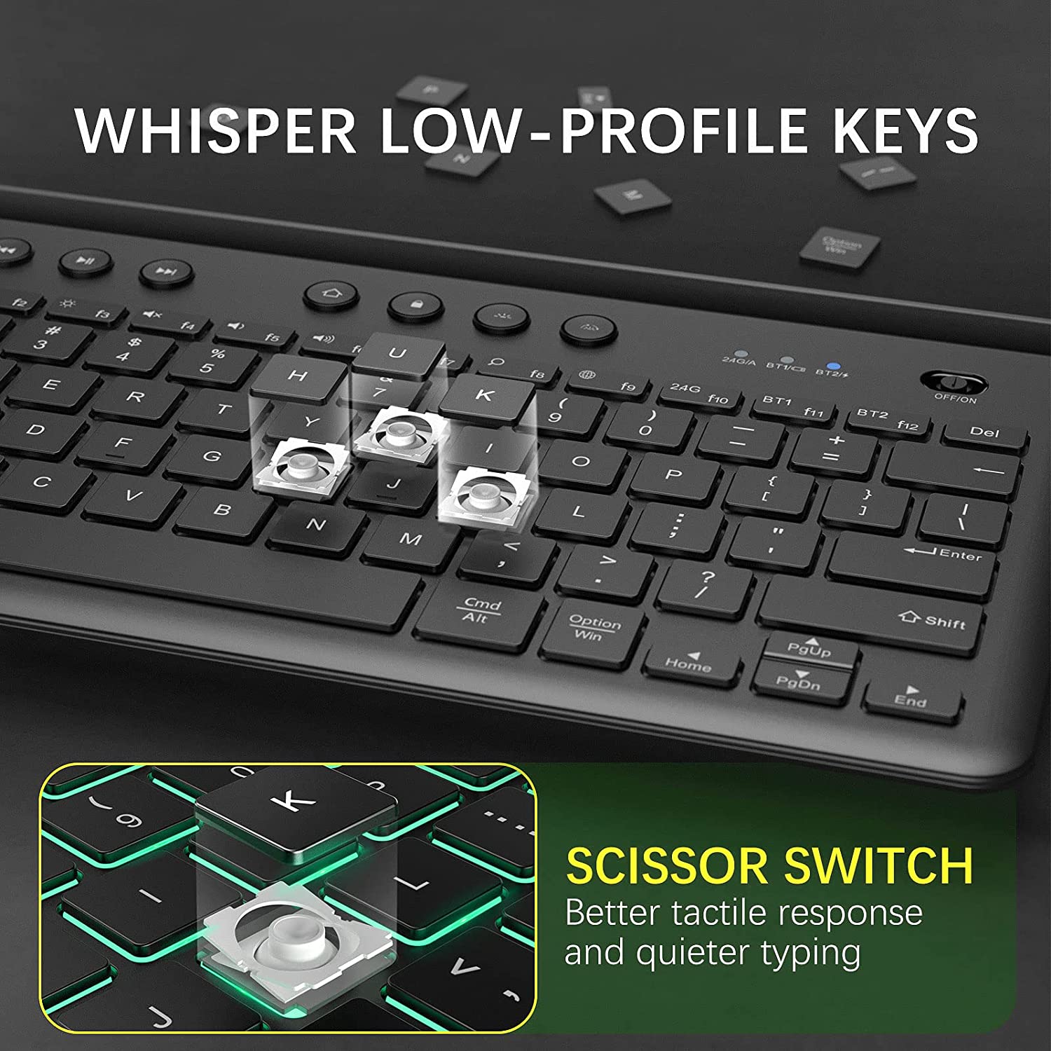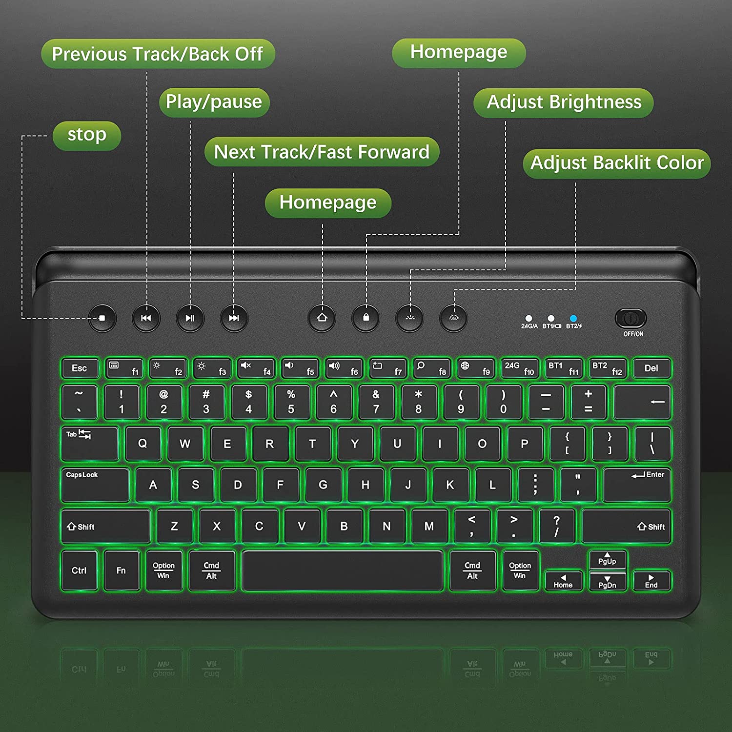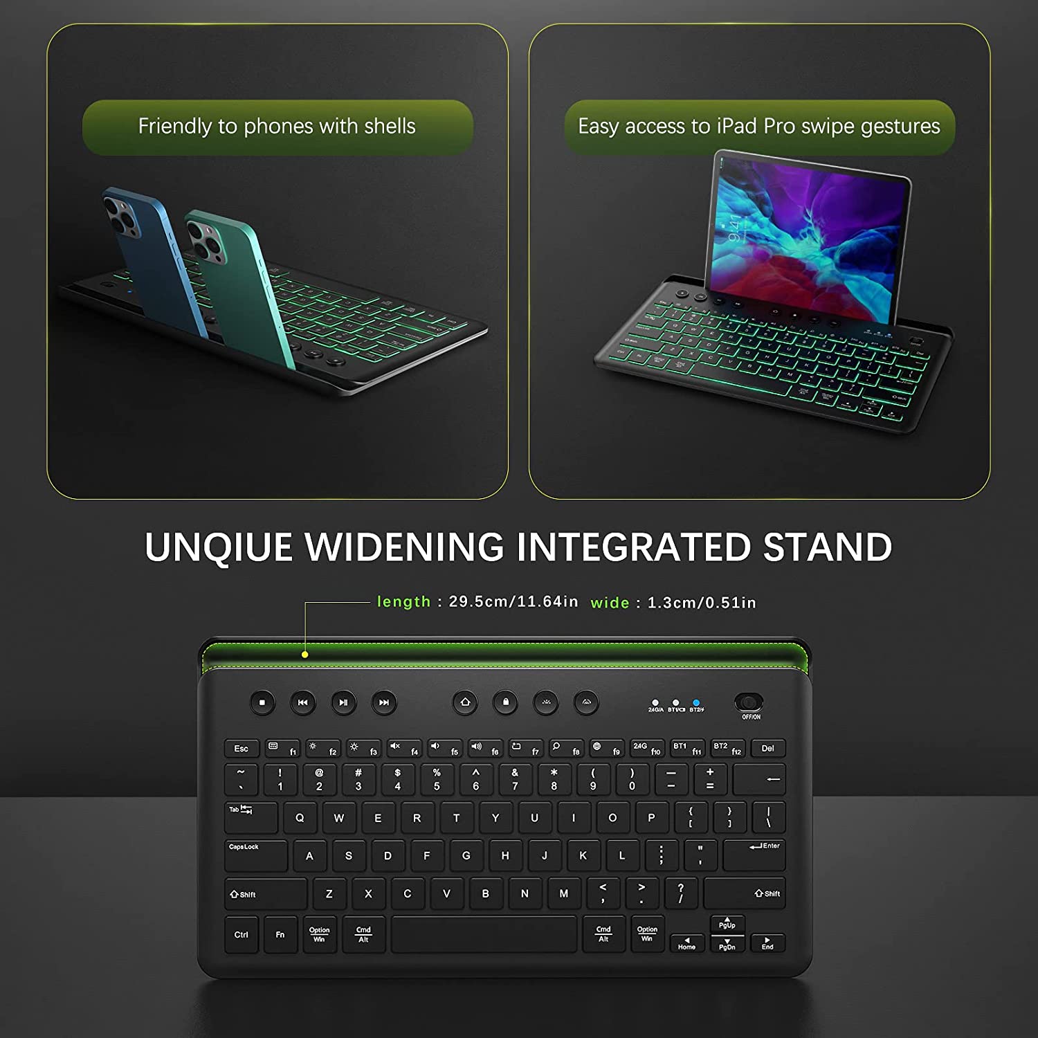 Conexión multidispositivo e interruptor multimodo el teclado se puede conectar a 3 dispositivos simultáneamente en iOS, MacOS, Windows o Android. También es compatible con teclados externos para conectar MacBook Air/Pro, iMac, Windows o laptop. Este teclado Bluetooth retroiluminado soporta conexión 2.4G, BT1 y BT2 para controlar 3 dispositivos. Puedes cambiar los modos a través del botón de interruptor de modo correspondiente para controlar los dispositivos. Diseño recargable y retroiluminado en comparación con los teclados con baterías externas, este tiene batería de gran capacidad incorporada, se puede recargar con el cable de carga adjunto. Cuando se recarga completamente, puede durar aproximadamente 60 horas de uso con trabajo constante. El teclado Bluetooth recargable tiene 7 colores de retroiluminación diferentes y brillo ajustable de 3 niveles. Diseño de soporte integrado que ahorra espacio el soporte superior integrado puede sostener el teléfono, la tableta u otros dispositivos móviles fácilmente. Puede mantener un ángulo adecuado para que leas y escribas simultáneamente. El teclado inalámbrico funcional ofrece el soporte integrado que ahorra espacio para ayudarte a sostener algunos dispositivos que ahorran espacio y hacen que tu escritorio esté ordenado. Teclas silenciosas y apagado automático las tapas silenciosas con el diseño del interruptor de tijeras hacen que el ruido de escritura se reduzca en gran medida. No te preocupes por el ruido, y puedes disfrutar de un ambiente de trabajo silencioso, adecuado para la oficina, el hogar, la biblioteca y otros lugares públicos. La función de apagado automático ahorrará energía y prolongará la vida útil del teclado inalámbrico. Trabaja sobre la marcha puedes trabajar en cualquier lugar y en cualquier momento con el teclado Bluetooth debido a su diseño compacto y ligero, innecesario llevar tu portátil pesado a todas partes. Es compatible con varios dispositivos, incluyendo iPhone, iPad, Lenovo, iPad Air, iPad Pro, iPad Mini, teléfono celular, tableta, PC, iOS, Windows, Android y otros dispositivos.
